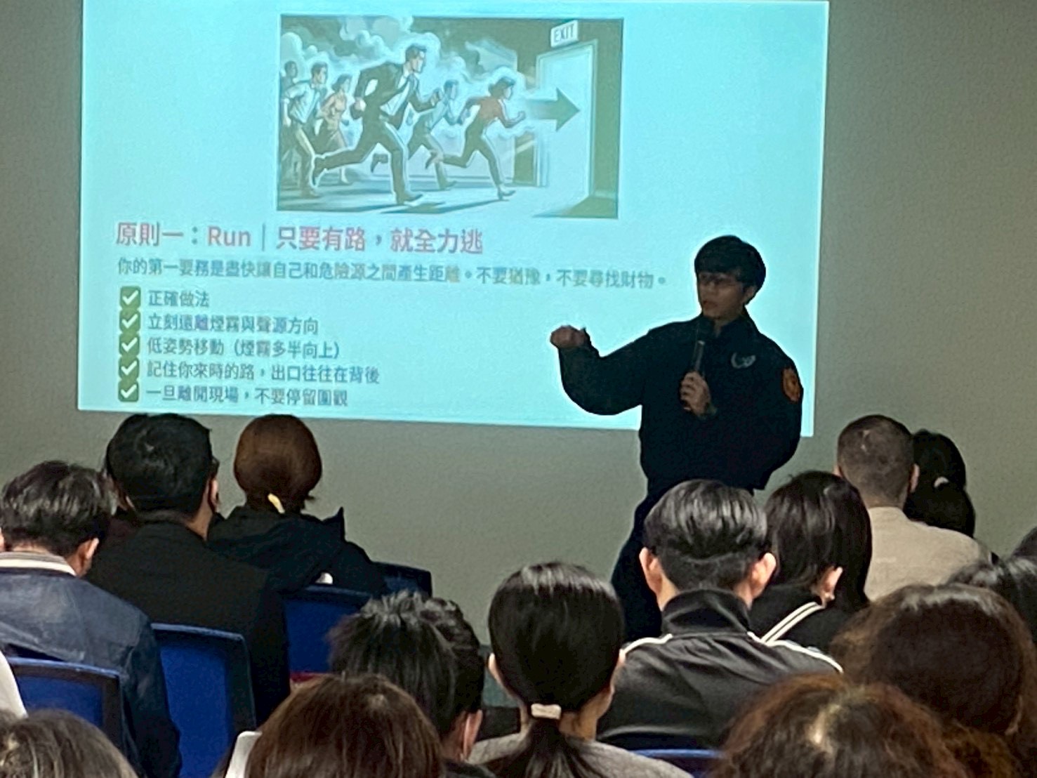 另因應近期臺北市捷運站隨機襲擊事件,本總隊並派員前往分享,以「一般民眾」、「店舖員工」角度,如何在緊急情況下做出應變,包含警覺性的建立、疏散引導、防止踩踏事故、煙霧彈特性認識等環節,以期在危機事件發生時,降低傷亡,期能營造三井賣場工作人員與遊客均更安心的購物環境。