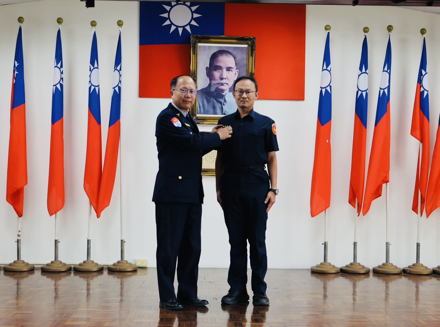 本總隊於114年10月8日總隊會報辦理新任巡佐授階典禮,由總隊長授予新任巡佐陳信宏一線四星階級章。陳員曾擔任新竹縣政府警察局警員、航空警察局警員及本總隊警員職務,從警資歷豐富今陞任巡佐 職務實屬不易,除予以祝賀,並勉勵陞職後能對於各項勤務、業務認真負責、盡心盡力、積極進取向上,繼續為本總隊貢獻心力。